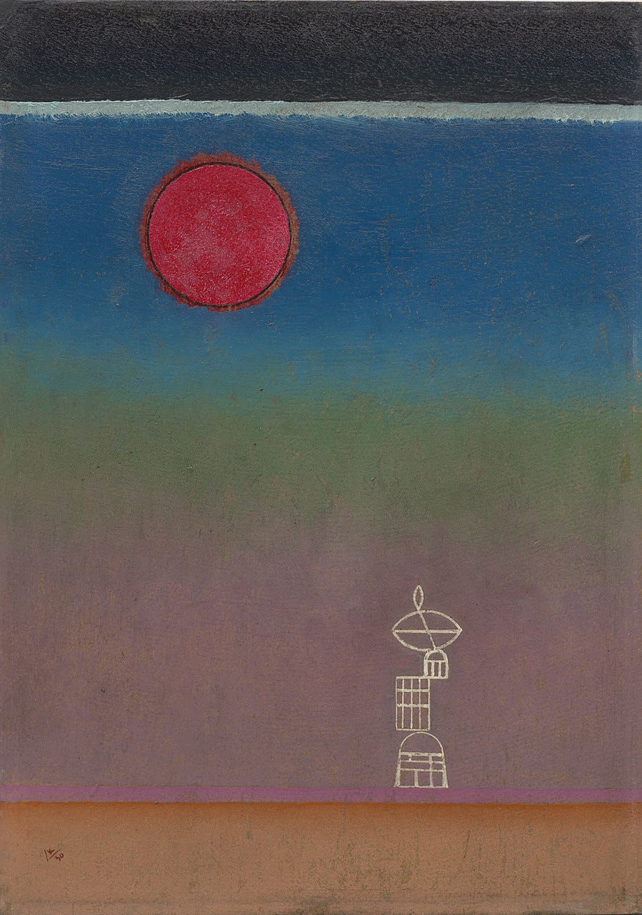 At the end, a final canvas stood alone: Far Away, 1930. A red orb hovered in a vast blue sky, glowing like a distant sun. Beneath it, a spindly white figure—a spire, or a tower, or perhaps something else entirely—rose from the ground like a question with no fixed language.