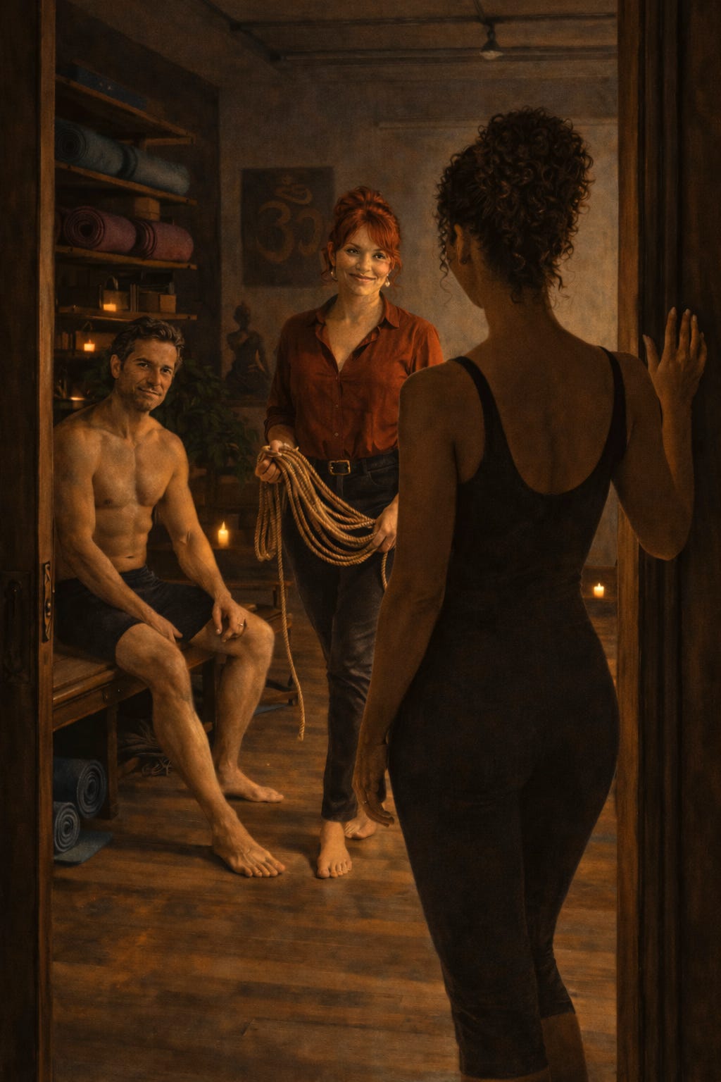 Eva felt it immediately—the heat of Dan’s skin through the thin fabric of her leotard, the solid reassurance of his body anchoring hers. Her pulse, already elevated, seemed to leap again, quick and undeniable. Dan felt it too: the subtle tremor beneath her skin, the telltale quickening at her throat when Cherry cinched a knot and drew them closer still.