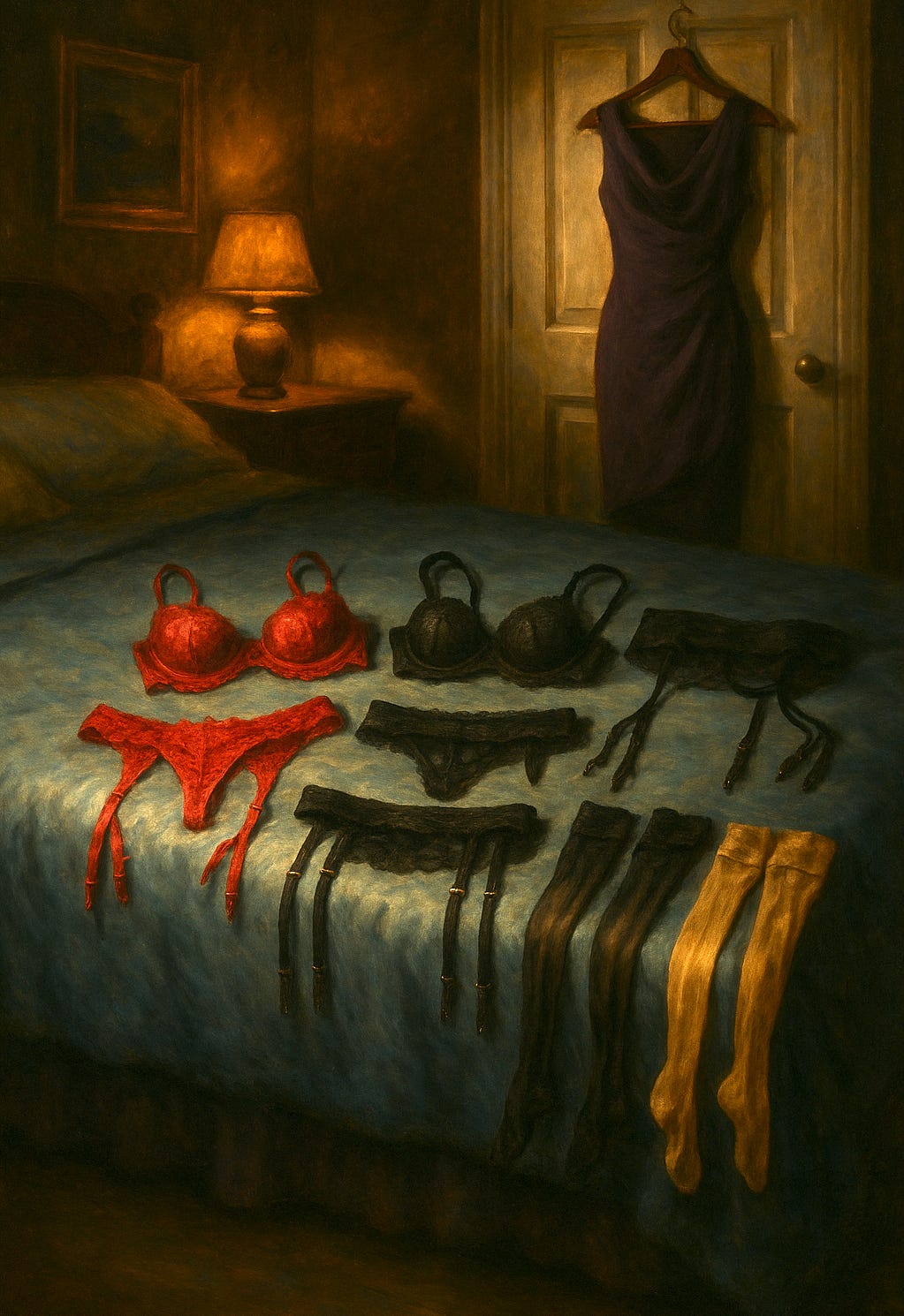Eva laid out the choices: stockings, garters, lingerie, dresses, heels. Harold took a seat across from her, eyes tracking every motion. She lifted each piece in turn, and he made his choices.
