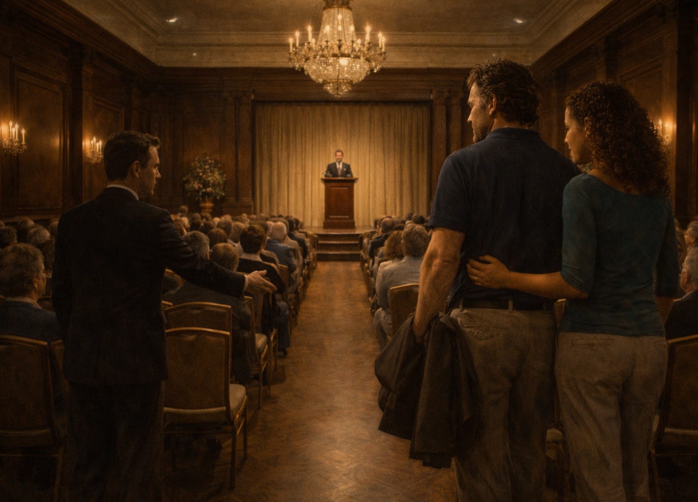 They arrived at the Order of the Bound Rose slightly behind schedule, their lateness the product of a closed street and an unhelpful city worker who’d waved their car in the wrong direction with cheerful confidence. By the time they slipped through the double doors, the hall was already darkened, the low murmur of settling bodies tapering into attentive quiet. An usher gestured to a row of chairs, and they picked their way across carefully, mouthing apologies as they moved. They sat just as the house lights dimmed further and a voice rose at the podium introducing the speaker.