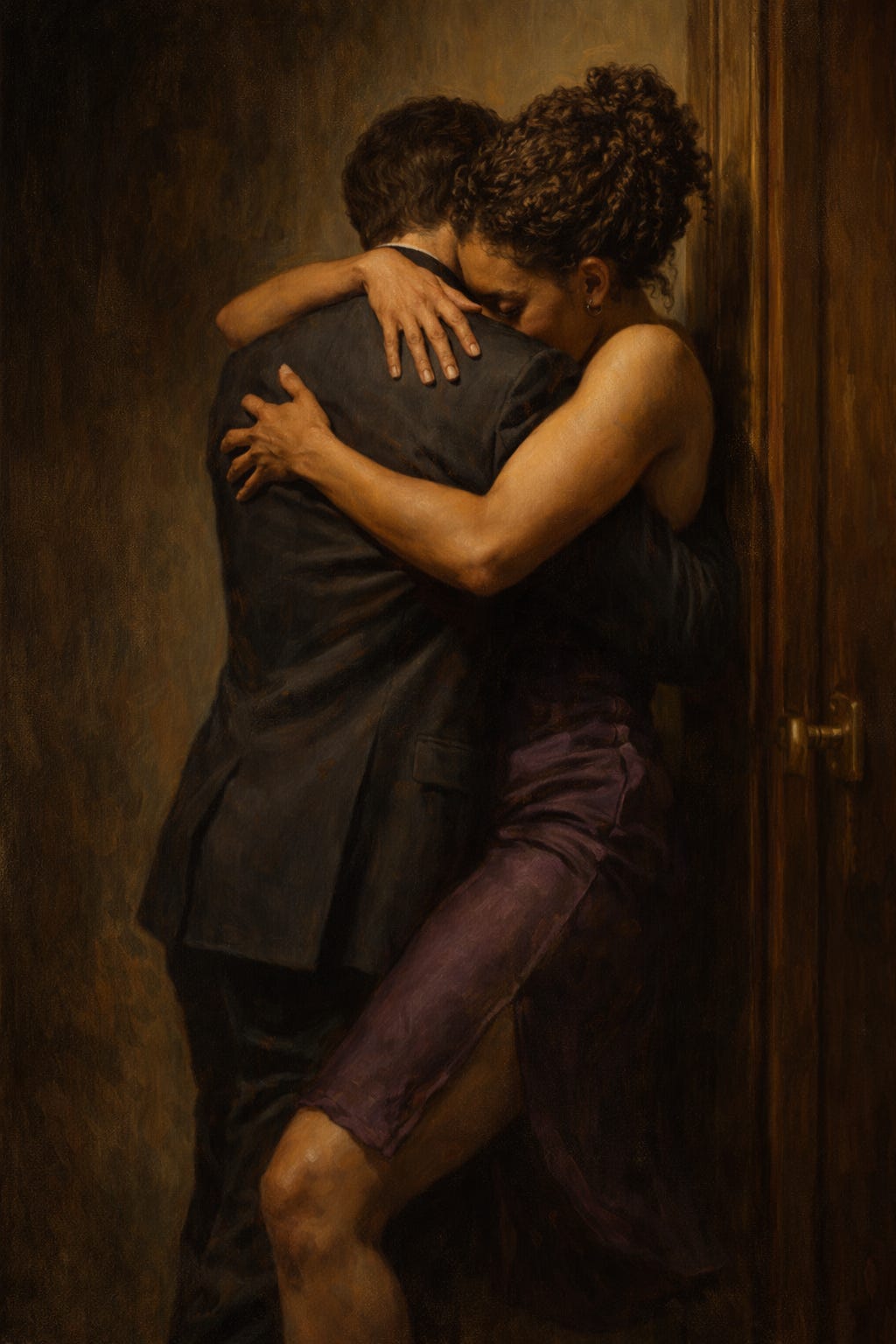 He pressed her harder against the door, and she let him drag his palms along the backs of her thighs, let him kiss her with the kind of intensity that left no room for thought. Her body answered before her mind could intervene, arching up and forward, meeting his grip with her own need, letting him take without flinching away.