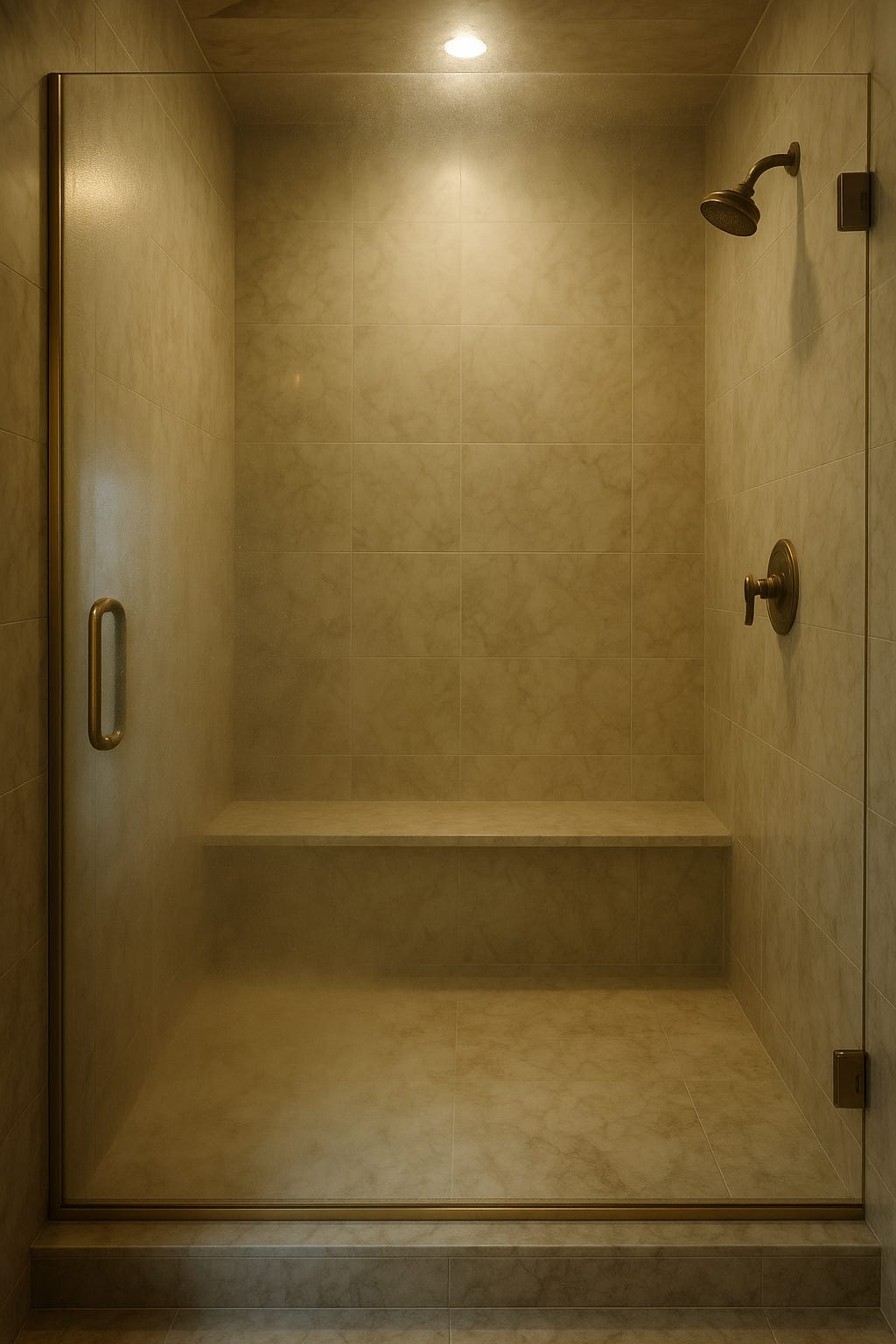 He sat back against the cool tile wall, still dripping, still breathless. Water poured steadily from above, steam rising in silken threads around them, softening the edges of the moment. Eva remained kneeling before him, her body glistening, dark lashes lowered in a mix of deference and calm.